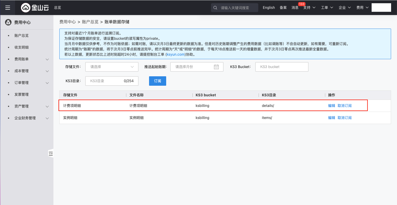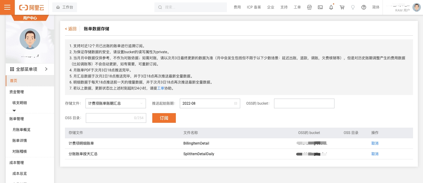 - 用户配置或修改账单文件信息时,将会采集当月账单,例如:3号配置了账单文件访问信息,将会采集1-2号的账单文件;30号配置账单文件访问信息,将会采集1-29号的账单文件。1号配置账单文件访问信息,将会采集上月1-31号的账单。