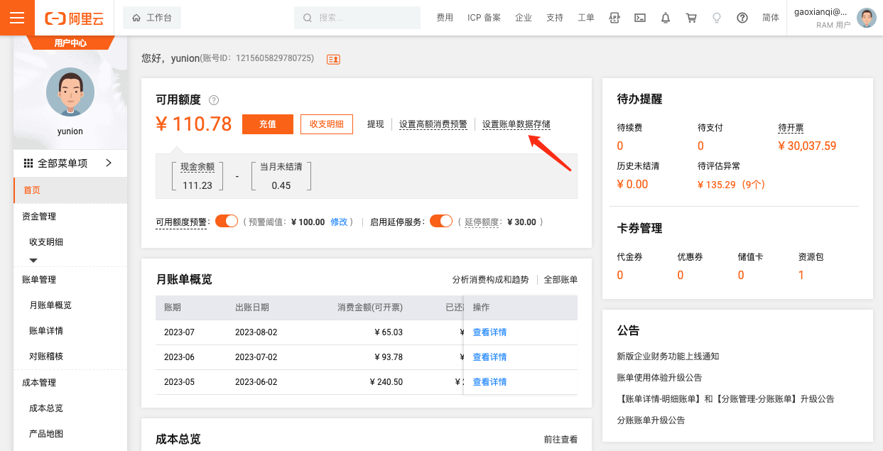 - 文件前缀:当账单bucket中除账单文件外还存放了其他文件时,需要配置文件前缀仅获取bucket中的账单文件等。阿里云的账单文件前缀为账号ID,可在账号管理-安全设置中查看账号ID。