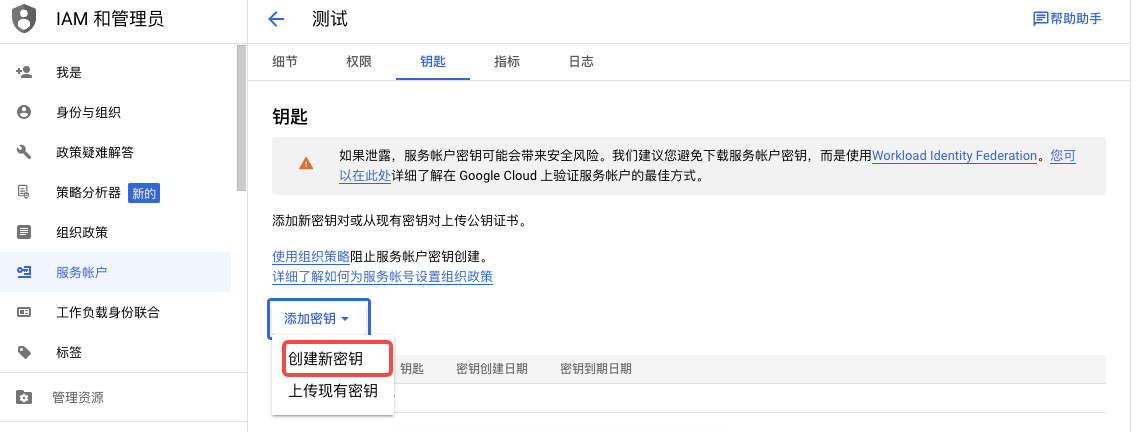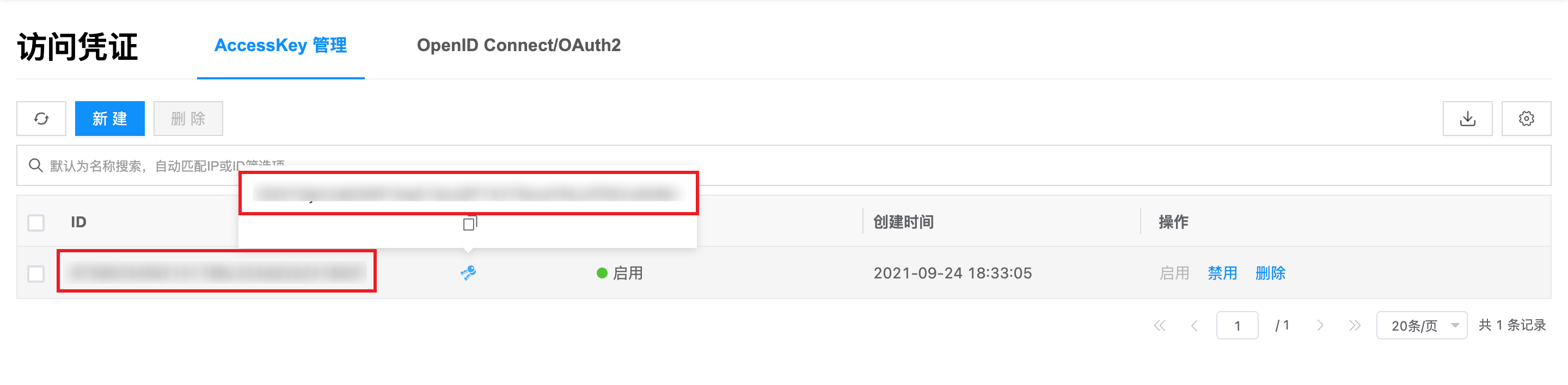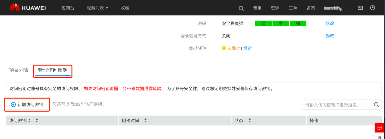 在安全信息管理页面,单击 "创建AccessKey" 按钮,创建AccessKey。