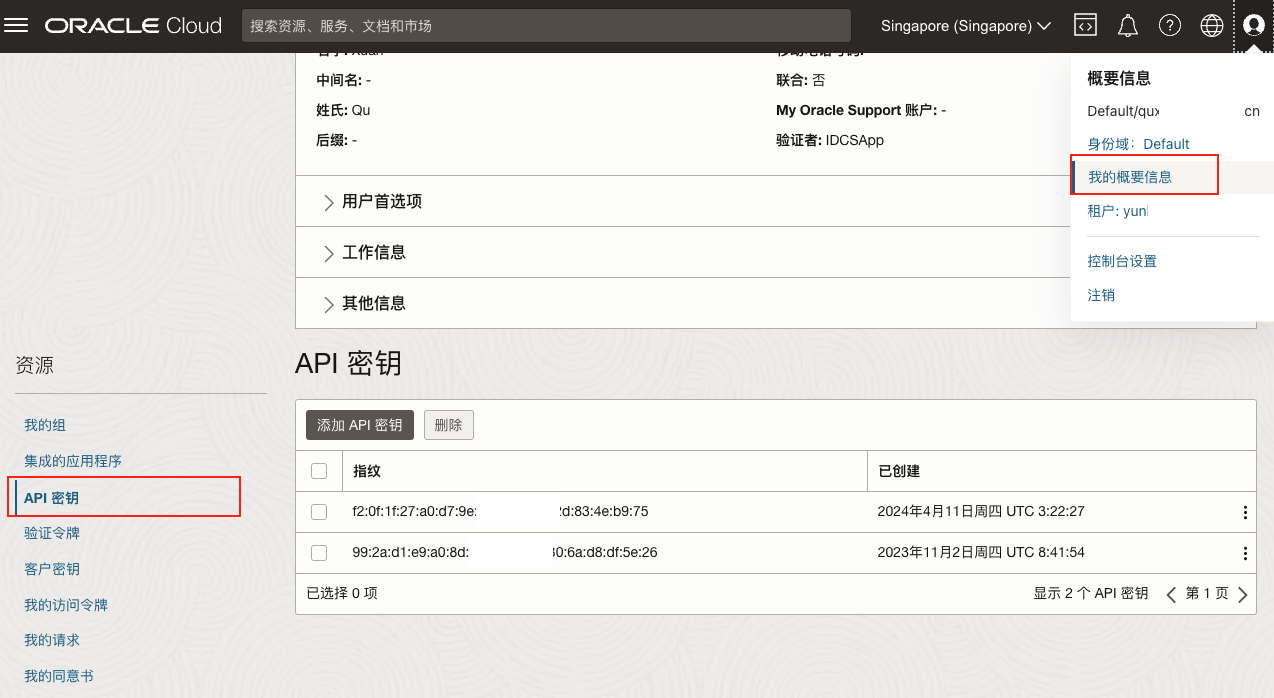 使用子账号登录阿里云控制台,单击页面右上角个人信息,展开下拉菜单,单击 "accesskey..." 进入安全信息管理页面。