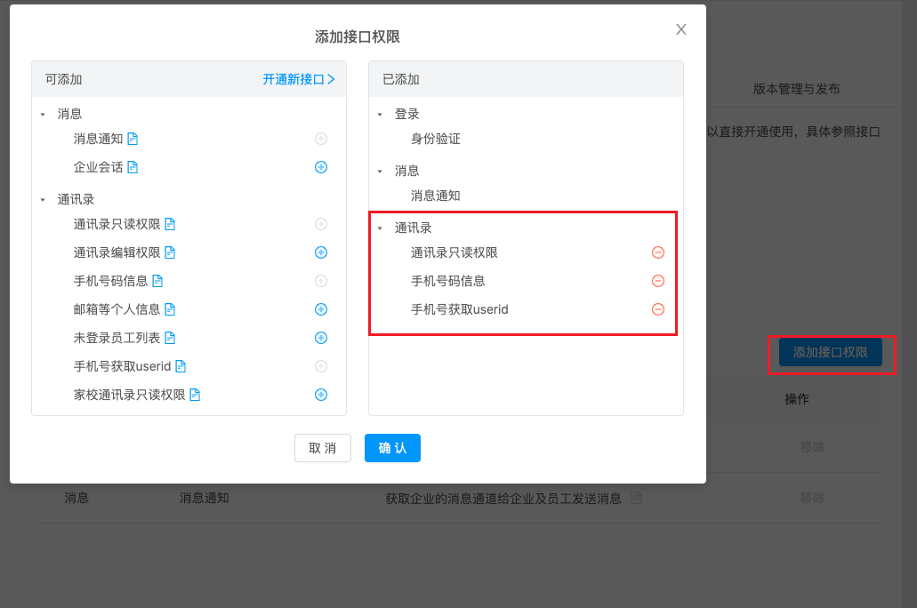 On the Permission Management page, it is recommended that the permission scope applies to "All Employees", or can be set according to requirements. Add interface permissions for the application as needed, at least add "Address Book Read-Only Permission", "Phone Number Information", "Get User ID by Phone Number", add other permissions as needed.