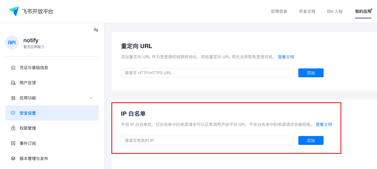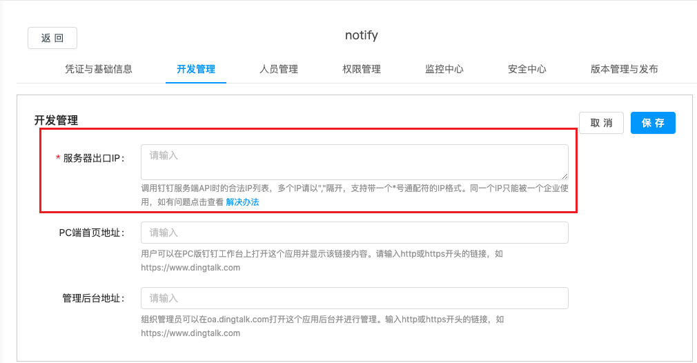 On the Development Management page, add the platform's external access IP to Server Exit IP.