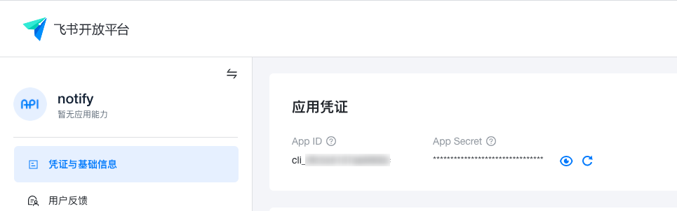 - AppSecret: Application secret key, generated by Feishu Open Platform when creating the app, can be used to obtain app_access_token. Can be viewed in Application Details Page > Credentials & Basic Information > Application Credentials module.