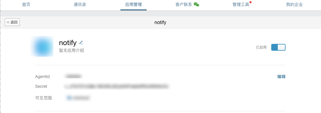 Obtain AgentId and Secret information in Application Details.