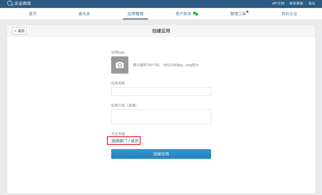 Under the Application Management tab, select Application - Create Self-Built Application, and configure the application's logo, name, application introduction and visible scope. It is recommended to set visible scope to "All Employees" or organizations applicable to the application.