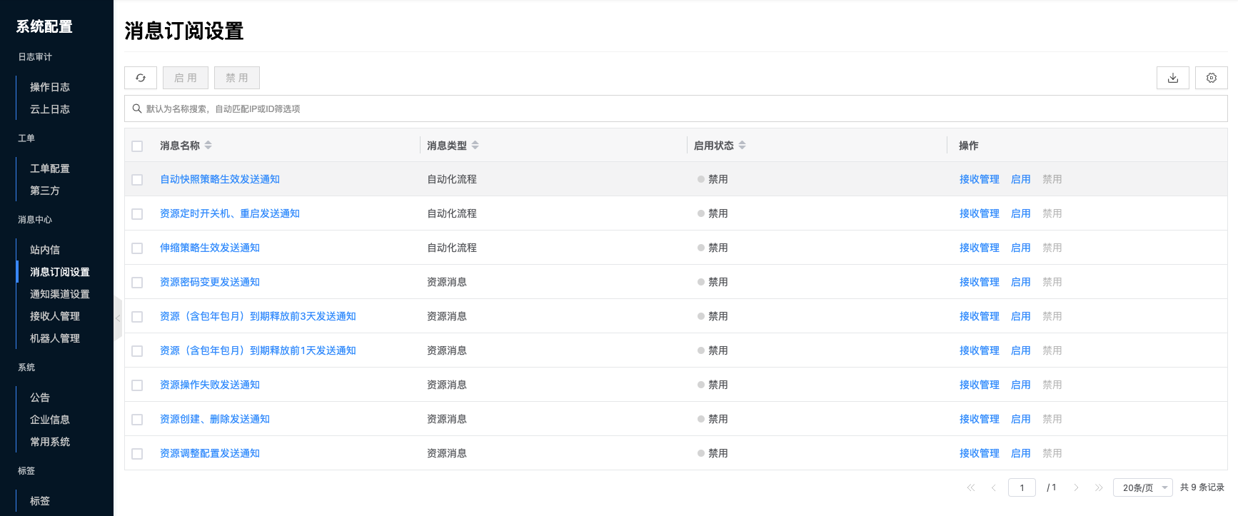 Entry: In the cloud management platform, click the navigation menu in the upper left corner, and click the "System Configuration/Message Center/Message Subscription Settings" menu item in the pop-up left menu bar to enter the message subscription settings page.